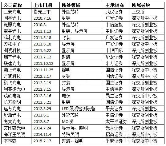 早在2013年之前,中國大陸以LED相關(guān)業(yè)務(wù)為主營業(yè)務(wù)成功登頂資本市場的就有17家公司(三安光電借殼上市除外),其中2010年2家,2011年7家,2012年8家。