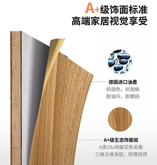 畔森生態板表皮采用A+級生態飾面紙,耐褪色、耐高溫、耐劃痕。質感高檔,3D超立體木質紋理,樣式選擇豐富。無論是日式小清新,現代簡約,還是高端奢侈歐式風,都能輕松駕馭。