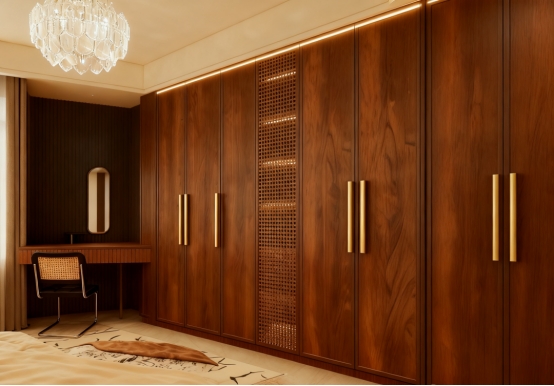 細節亮點:在結構上,采用模塊化組合設計,將衣柜與梳妝功能區一體化打造,既優化了空間利用率,又通過材質與線條的呼應,實現視覺上的整體感。細節處,衣柜門板的簡潔線條與隱藏式五金件結合,營造出“less is more”的現代感;同時,胡桃木的天然紋理成為空間的“隱性裝飾”,無需過多雕琢便盡顯中式家居的氣韻。
