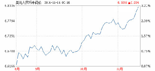 轉視人民幣匯率,雖然其如今基于一籃子貨幣,但美元仍然占較大權重。11月10日,人民幣中間價下調53個基點報6.7885,連續第五天下調,再度刷新逾六年新低,直接反映了美元反彈的影響。