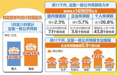 12月17日,財政部發布統計數據顯示,1月至11月累計,全國一般公共預算收入178967億元,同比增長3.8%,增幅比去年同期回落2.7個百分點。全國一般公共預算支出206463億元,同比增長7.7%,增幅比去年同期提高0.9個百分點。