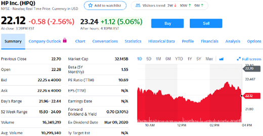 惠普星期一在紐交所的開盤價(jià)為22.28美元。截至收盤,惠普股價(jià)下跌0.58美元,報(bào)收于22.12美元,跌幅為2.56%。截至美國(guó)東部時(shí)間2月24日下午4:48(北京時(shí)間2月25日早上5:48),盤后交易中惠普股價(jià)上漲1.15美元,漲幅為5.2%,暫報(bào)23.25美元。過去52周,惠普股價(jià)最高為24.09美元,最低為15.93美元。