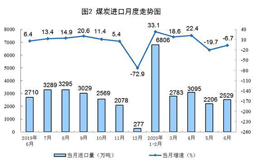 煤炭進口下降。6月份,進口煤炭2529萬噸,環(huán)比增加323萬噸,同比下降6.7%;上半年,進口煤炭1.74億噸,同比增長12.7%,比一季度回落15.7個百分點。