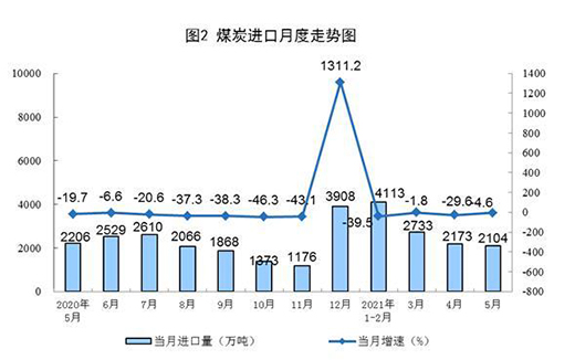 原煤生產(chǎn)由降轉升。5月份,生產(chǎn)原煤3.3億噸,同比增長0.6%,上月為下降1.8%,比2019年同期增長0.6%,兩年平均增長0.3%,日均產(chǎn)量1053萬噸;進口煤炭2104萬噸,同比下降4.6%。