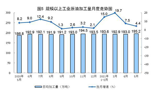 1—5月份,生產(chǎn)原油8265萬噸,同比增長2.2%,比2019年同期增長4.1%,兩年平均增長2.0%;加工原油29274萬噸,同比增長12.0%,比2019年同期增長10.8%,兩年平均增長5.3%。