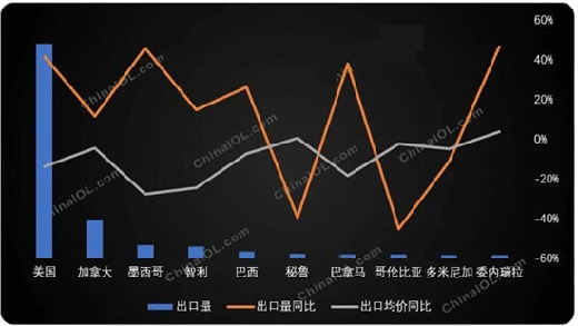 從出口至美洲的TOP10國家來看,美國和墨西哥同比都呈大幅增長,其中美國的量超過400萬臺,占出口至全美洲總量的67%左右;出口至哥倫比亞的量同比下滑最多。出口量與出口均價有一定的負相關性。