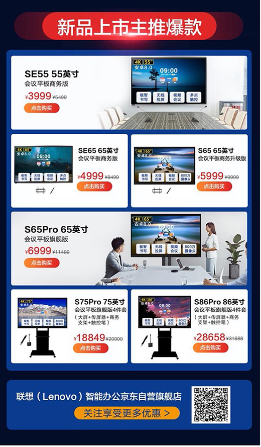 以最新上線的聯想SE系列新品聯想SE55為例,創新時間回溯功能,可隨需撤銷至任一畫面,且任意界面隨意批注,手機掃碼即可獲取會議記錄,智能會議更高效;升級“筆鋒”書寫體驗,還原真實書寫感受,且支持手心/手背擦除功能,輕松消除字跡;擁有4K超清分辨率,結合防炫光大屏,讓細節一覽無余;硬件傳屏無需驅動,支持手機硬投屏;支持第三方會議軟件,會議畫面、聲音傳輸實時無延遲。該產品原價為5499元,而從9月22日至26日到手價僅3999元,直降1500元,正是采購的好時機。