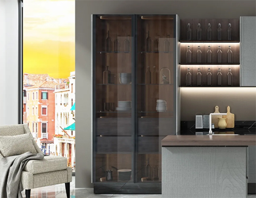 功能齊全的可視化玻璃高柜,讓收納變得輕而易舉,新型鋁框玻璃門和玻璃層板結合在一起,更是流露了主人對生活細節(jié)的追求。
