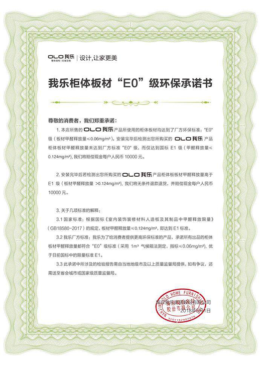 此外,面對人們對于“E0”級環保標準的質疑,我樂櫥柜做出了為購買者提供專屬《我樂柜體板材“E0”級環保承諾書》的重大決定,竭力讓每一位我樂櫥柜用戶都買得放心,用得安心。