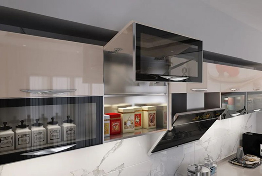 吊柜以米黃色上翻門搭配黑色包邊玻璃上翻門,吊柜內部搭配上吊柜頂板感應,打開柜門即可照亮柜內空間,智能又方便。