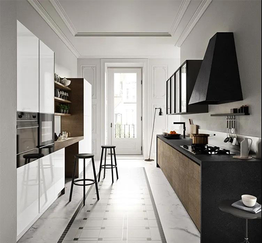 收納是家居的重點,更是廚房的重中之中,廚房本來就多零碎的小物件,容易形成雜亂的空間,在設計的時候就要考慮到小廚房應該盡量的將收納功能做到最優,可以采用轉角柜來收納廚房的大量物品。在地柜、吊柜之外的空白空間,可以采用層疊的儲物柜、電器架等小物件,也可在墻上安裝一些可以掛日常烹飪的廚具,操作上平時使用起來方便,也可以讓您的廚房變得更加干凈整潔,更有高級感。