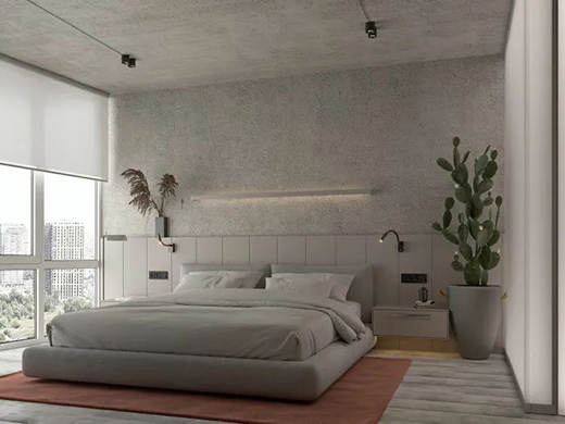 主臥室色調(diào)給人一種舒適與寧?kù)o感,玫瑰粉色地毯是這個(gè)灰色空間融進(jìn)的一絲“光亮”與溫柔,層次感躍然而生,更為淡雅!
