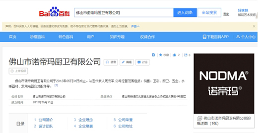 百度百科作為多種網絡平臺的“中心點”,與百度搜索、百度知道結合,從不同的層次上滿足用戶對信息的需求,實現信息最大價值化。正因如此,諾帝瑪將此作為重點“攻破”對象,以簡明扼要的文字建立起企業的百科詞條,有效提升品牌公信力和權威性。