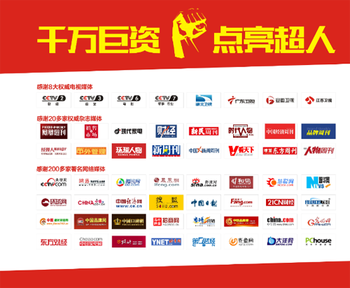 早在1995年,超人便開始在中央電視臺一套、二套、三套、五套、六套、七套、八套等各大媒體展開大力度廣告投放,以鑄就超人品牌持續影響力,實現超人市場份額持續增長,幫助經銷商完成銷售目標。截止目前,超人曾在央視星光大道、開門大吉、鄉約、新聞頻道、電影頻道等,以及江蘇衛視非誠勿擾等各大熱門欄目投放過大量廣告;與影視巨星簽約6年,以強化超人品牌知名度。