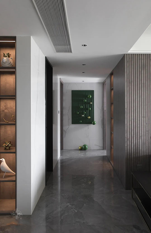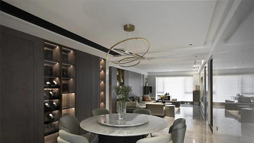 以生活的溫度為線索,從空間布局開始,以巴黎世家柔光瓷磚帶來的自然灰為主色調,營造有溫度、有氣質的生活格調。以客廳為中心,使用多種材質表現,利用發散性的思維,構想出現代家居場域富有高級感的情境營造。