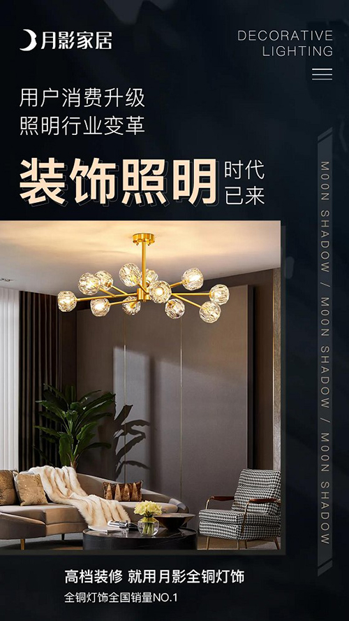 裝飾照明頭部品牌月影家居近期將超高性價比的系列產品以 1999 元的國民價格重磅推出,僅需 1999 元即可購齊全屋燈具,現代、中式、輕奢、北歐、歐式、美式六大風格,適應各類家裝需求。