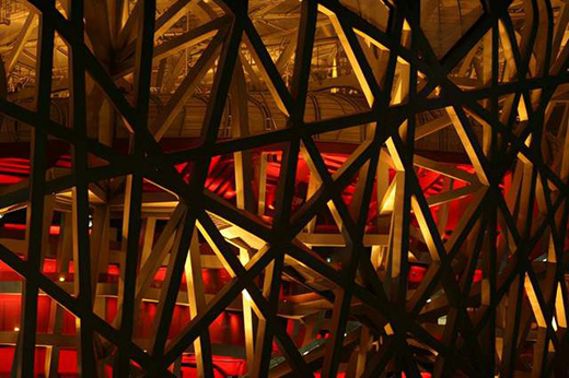 用特制LED燈具照亮紅墻,用投光燈向外照射鋼結構,形成場館內亮外暗的視效,華藝還實現了鳥巢的另一個文化主題的呈現——“剪影”。