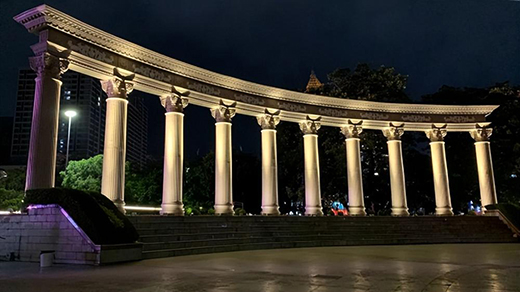 本次亮化工程聚焦在嘉年華主會場——古鎮人民廣場。為在夜幕下完整還原廣場標志性羅馬柱的藝術質感,調和出大氣恢弘的視覺效果,燈具上選配了窄光束角、大功率的投光燈強調整體輪廓,并配有防眩遮光罩,以暖色燈光烘托建筑美感。