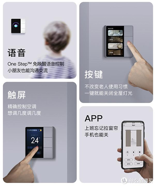 該款開關面板擁有4大交互模式,適合全家人不同需求。除了科技感觸屏之外,還保留了按鍵,方便老人傳統使用習慣。語音識別和APP控制方式,可遠程操作,不必起身。