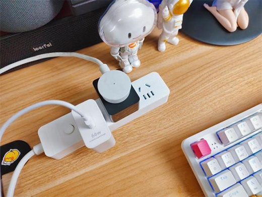 設計上很小巧,差不多一個雞蛋的大小,放在插線板上時,不會占用太多的空間。