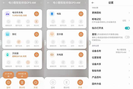 如上圖,三位插座分別設置了給電動車充電8小時倒計時關閉、給魚缸水泵設置每開2小時關1小時的循環任務以及給滅蚊燈設置每天18:00開啟第二天7:00關閉的定時。另外插座還可以設置斷電記憶、指示燈開關、童鎖等