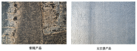 太空堡卷材吸熱少,表面溫升低,室外溫度25攝氏度,在陽光下曝曬1小時候后,表面溫度低于常規產品近30℃。