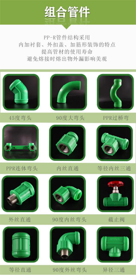 PP-R管件結構采用內加襯套、外扣蓋、加強筋形裝飾的特點,提高管材的使用壽命,避免熔接時熔出物外漏影響美觀。