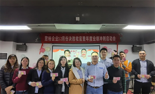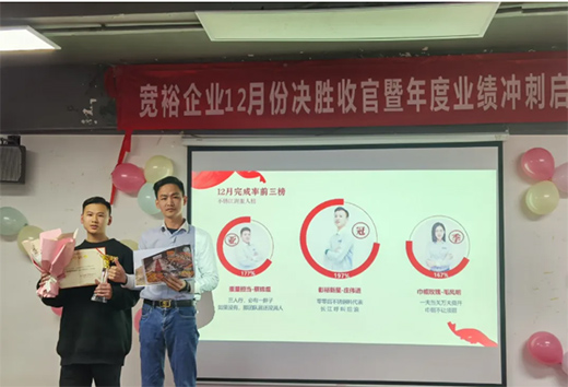 1月6日晚上,寬裕企業“快樂掙口糧,幸福過肥年”之12月收官之戰總結及頒獎典禮在企業總部三樓會議室隆重舉行!經過了一個月的奮戰,經過一次啟動及二次啟動的疊加推進,每天早開會、晚總結,一個一個看似微不足道的動作,全都為了指向最終目標的勝利實現!寬裕的全體戰士們最終以100%完成沖刺任務的彪炳戰績為2020年畫上了圓滿的句號!在此,小編僅代表寬裕企業感謝所有英勇奮戰的戰士們!感謝臺前幕后所有的伙伴們共同推動了本次收官之戰的勝利!1月6日,我們勝利會師啦!