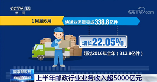 數(shù)據(jù)顯示,1至6月,郵政行業(yè)業(yè)務(wù)收入完成5028.23億元,增長(zhǎng)11.03%。其中,快遞業(yè)務(wù)收入完成3823.8億元,增長(zhǎng)12.57%,快遞業(yè)務(wù)量完成338.8億件,增長(zhǎng)22.05%,超過2016年全年(312.8億件)。