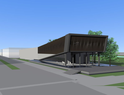 從外觀上看,新展廳似兩個長方體疊加在一起的長條形,微微上斜的前端,配合周圍的景觀水池,猶如騰躍而出的鯤鯨,隱有欲化形沖向天際的趨勢。而外圍的景觀水池更將整個建筑更加立體和生動。有魚必有水,靈動的水的元素不僅將建筑的硬朗外觀進行了中和,倒映的立面更讓空間做了再次了延伸,動靜相宜。