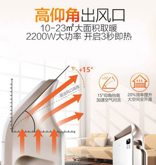 取暖器什么牌子好?好用的電暖器品牌?艾美特HCA22132R-WT電暖器采用高仰角出風口設計,15度仰角加速空間空氣有效對流,大面積取暖能有效提升20%效率,快速提升室內空間溫度。