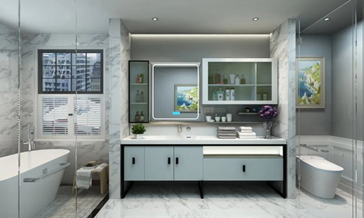 走進這一新款智能衛浴標間,功能分區明確,收納智能兩不誤,鏡內嵌入LED燈光系統,可依據需求選擇三色亮光,無論是光線昏暗的早晨、傍晚、或是陰雨天,不開衛生間頂燈也能完成物品的拿取與存放。