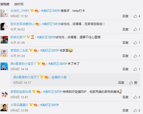 世間的美好都與你環(huán)環(huán)相扣,去玩、去美、去動(dòng)、去吃才是這個(gè)美好季節(jié)應(yīng)該有的主旋律~所以在5月4日,美的在@美的小美的官方微博上面發(fā)起了留言互動(dòng),邀請(qǐng)粉絲分享他們認(rèn)為當(dāng)下最美好的事情是什么,讓整個(gè)活動(dòng)聲量得以在社交平臺(tái)擴(kuò)散傳播。