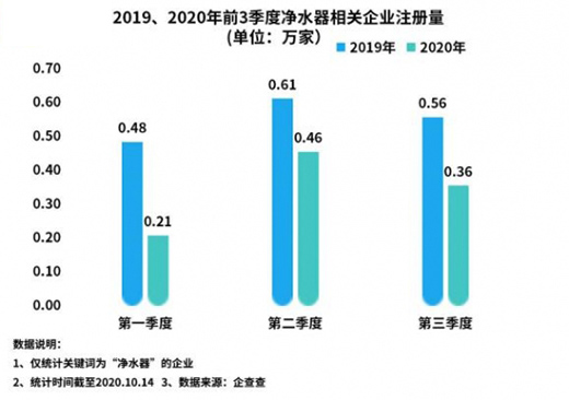 隨著環境污染的加劇、水源地被破壞、污染物種類的增加,以及人們對越來越優質生活的追求,家用凈水器設備應運而生。企查查數據顯示,截止2020年10月,我國共有13.7萬家凈水器相關企業。