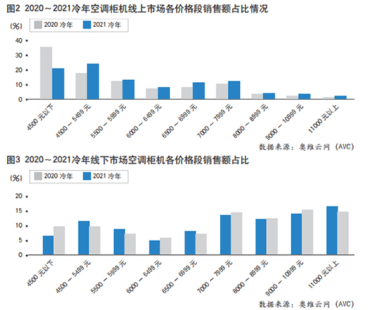 從價(jià)格結(jié)構(gòu)來看,大宗商品價(jià)格自2020年4月至今連續(xù)17個(gè)月增長(zhǎng),企業(yè)的規(guī)模優(yōu)勢(shì)在成本持續(xù)增長(zhǎng)面前被壓縮,而生產(chǎn)材料庫存、期貨/對(duì)沖貿(mào)易等優(yōu)勢(shì)消耗殆盡,成本壓力不可避免地傳導(dǎo)至零售終端。上游原材料價(jià)格的長(zhǎng)期持續(xù)性增長(zhǎng)成為企業(yè)短時(shí)間難以消化的難題。從生產(chǎn)端來看,與其他白電相比,以金屬、制冷劑等為核心的空調(diào)生產(chǎn)面臨更大的成本壓力。而能效等級(jí)的迭代對(duì)空調(diào)產(chǎn)業(yè)的結(jié)構(gòu)升級(jí)起到極大的助推作用,也為企業(yè)釋放生產(chǎn)成本壓力提供了一定的空間。綜合來看,空調(diào)零售市場(chǎng)漲價(jià)已成不爭(zhēng)的事實(shí)。如果線下市場(chǎng)高端產(chǎn)品銷售占比增長(zhǎng)與性價(jià)比需求向線上渠道轉(zhuǎn)移有關(guān),那么線上市場(chǎng)高端產(chǎn)品銷售占比的提升則直接印證了空調(diào)行業(yè)全面高端化的趨勢(shì)。奧維云網(wǎng)(AVC)監(jiān)測(cè)數(shù)據(jù)顯示,2021年1~7月,8000元以上柜機(jī)在線上市場(chǎng)占比為8.9%(見圖2),同比增長(zhǎng)2.6個(gè)百分點(diǎn);8000元以上柜機(jī)在線下市場(chǎng)占比為44.7%,同比增長(zhǎng)0.9個(gè)百分點(diǎn)(見圖3)。從2021年冷年來看,空調(diào)行業(yè)逐漸向高端化邁進(jìn)。