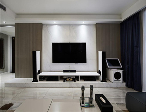 不管是大戶型還是小戶型,只要設(shè)計(jì)得當(dāng),背景墻都能做出大氣的效果。請(qǐng)記住,電視背景墻也是反映業(yè)主氣度和心胸的具體表現(xiàn)形式。如果背景墻面積較大,無(wú)論橫向還是縱向,都可以充分利用,為了避免單調(diào),可以用兩三種不同材料來(lái)進(jìn)行切割和造型,或者進(jìn)行立體構(gòu)圖體現(xiàn)層次感。