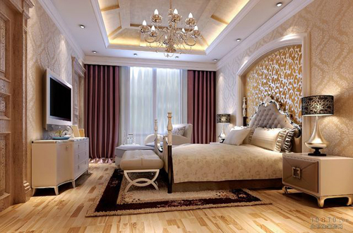 臥室的床背景,以營造氣氛為主,一般以墻紙為主,顏色以暖色系為主,也有的用飾面板。