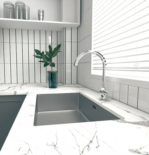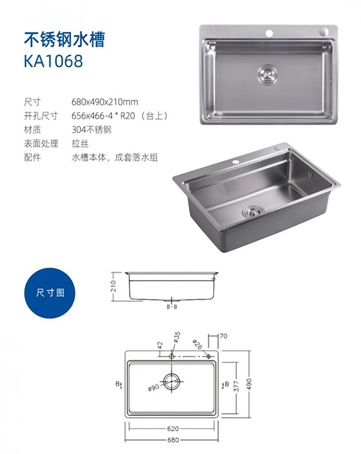 大單槽。與KA1068-B1搭配成槽中槽,單雙槽靈活切換;0.8mm厚韓國浦項304不銹鋼;柔絲處理,細(xì)膩美觀,耐刮耐磨耐熱易清潔;小R角盆體空間最大化;雙層翻邊,貼合度好,承重力強(qiáng);安全下水系統(tǒng),快速排水不堵塞;防冷凝涂層,防止冷凝水損壞櫥柜;配備橡膠消音墊,降低蓄水時產(chǎn)生的噪音。