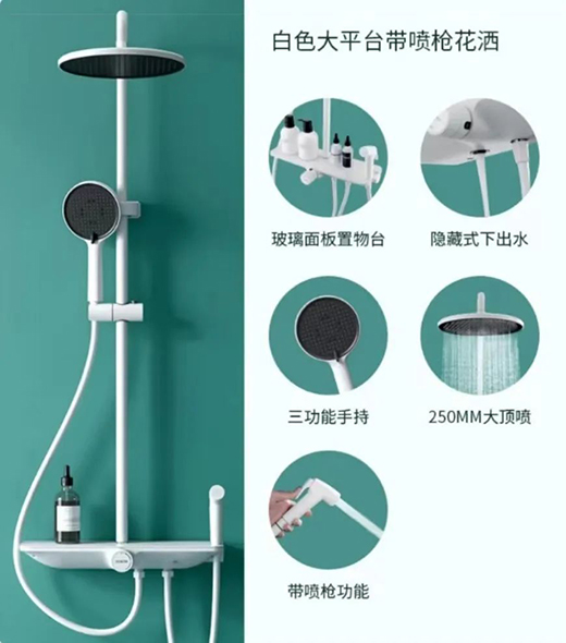 外觀設計上采用簡約時尚風,白色啞光漆面高級感十足,內里配置萬海陶瓷閥芯,龍頭每天按100次開合,也可用30年,還有超大置物架,方便沐浴時隨取隨用,讓每一次沐浴都變得精致舒適。