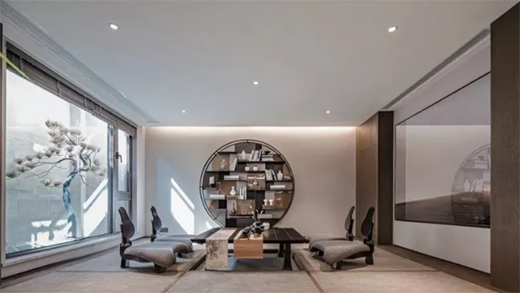 幾何藝術吊燈,簡潔的家具形狀,建筑空間的當代美學格調,而一旁的巨框水墨畫作突出東方筆觸,頗顯意境。