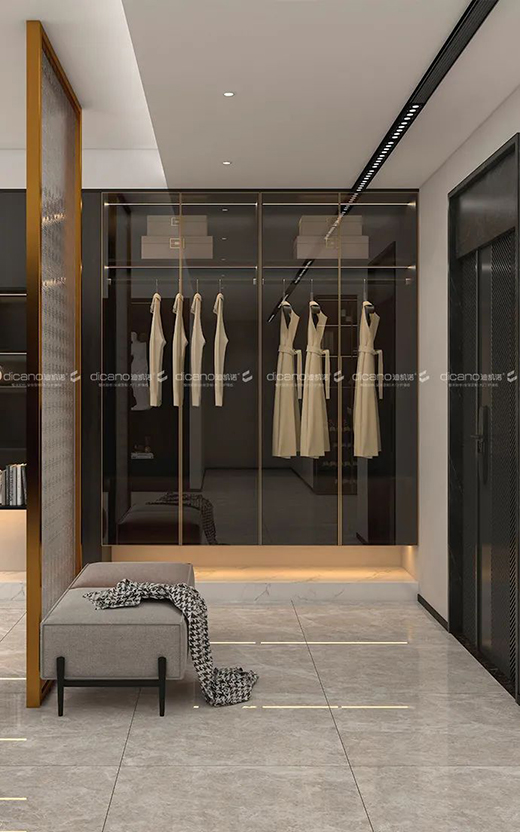 玄關位置,設計師為了方便主人的換衣出行,設計了一組到頂式衣柜,可以放一些外套、包包等出門出門必需品。衣柜下方裝有感應式燈帶,黑夜降臨時成為照亮入戶的光。正對門口放了換鞋凳,出行換鞋更加方便。玄關與客廳用了一扇磨砂玻璃作為隔斷,讓玄關位置采光更加明亮。