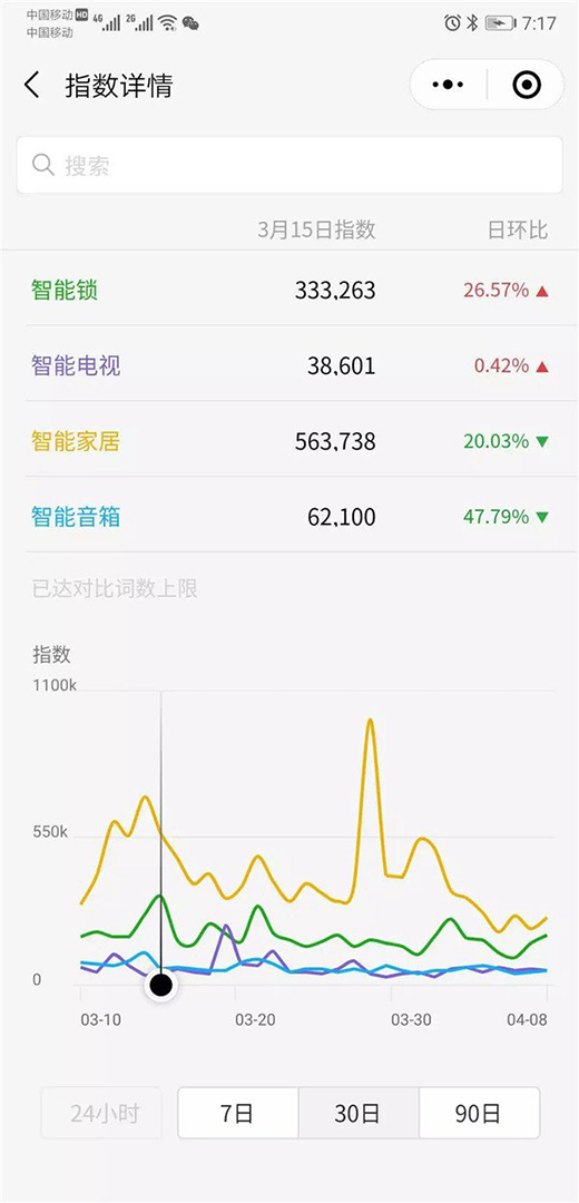 而微信作為用戶量破10億的國內最大的社交APP,微信指數可以說最能反應每一個行業的發展狀況及用戶關注度。從近30日的“微信指數”走勢來看,3月15日“智能鎖”關鍵詞指數最高,為33263,同一天智能電視及智能音箱的微信指數分別為38601和62100(見上圖)。