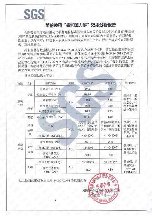 現在來解釋美的首創“離子態控水抑菌磁力鮮科技”,這里面有個關鍵詞——30mT,30mT是美的冰箱在經過上百種果蔬的保鮮效果測試后最終選出的最優磁場保鮮強度。簡而言之,30mT離子態控水抑菌磁力鮮技術,可利用磁場對離子運動的影響,實現小分子鎖水、離子態抑菌、抗氧化護色、高維C凝鮮四大保鮮優勢;诖,有業內分析認為,美的冰箱這種首次介入食物微觀內部,采用創新研發的30mT離子態控水抑菌磁力鮮技術,已經突破了行業介入多種宏觀環境條件進行保鮮的常規手段,進而從果蔬內部進行鎖水,以磁場作用減緩和降低果蔬氧化速度、酶類物質活性,實現果蔬色澤持久鮮靚。據了解,該技術已經通過SGS的認證,同時也得到了華測檢驗機構——中國第三方檢測與認證服務的權威機構認可。