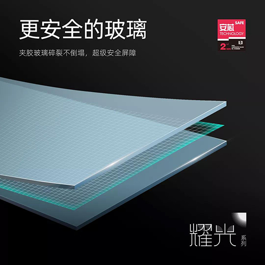 全系列使用自主研發(fā)的合芯技術(shù)夾膠玻璃,比起普通鋼化玻璃碎裂后呈爆炸式濺射的碎片傷人,夾膠玻璃碎裂后不倒塌不散射碎片,更加保障使用者的生命安全,有效降低淋浴房自爆后受傷的幾率。