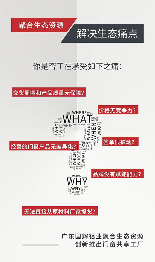廣東國輝鋁業打破門窗行業傳統模式,打造業內門窗共享工廠,實現門窗產品及其所需的原材料、智造設備、生產技工、OEM服務等的共享化,并以會員合作共享模式,讓會員成為自己所售產品的生產老板,進而實現門窗產品原材料成本、配件成本、人工成本、交付周期的可控和可見,最大化提升產品銷售利潤和競爭力。