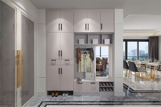 玄關柜錯落有致,地柜、壁柜、層板等設計元素均有,可以滿足各種收納需求,地柜采用編織門,有利于鞋子散發氣味,讓鞋柜更加清爽。