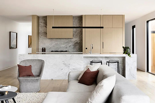 淺色系的木飾面與大理石的完美結合,極簡利落的配色,大理石的光滑材質也更容易清洗,增加了做飯時的愉悅感。