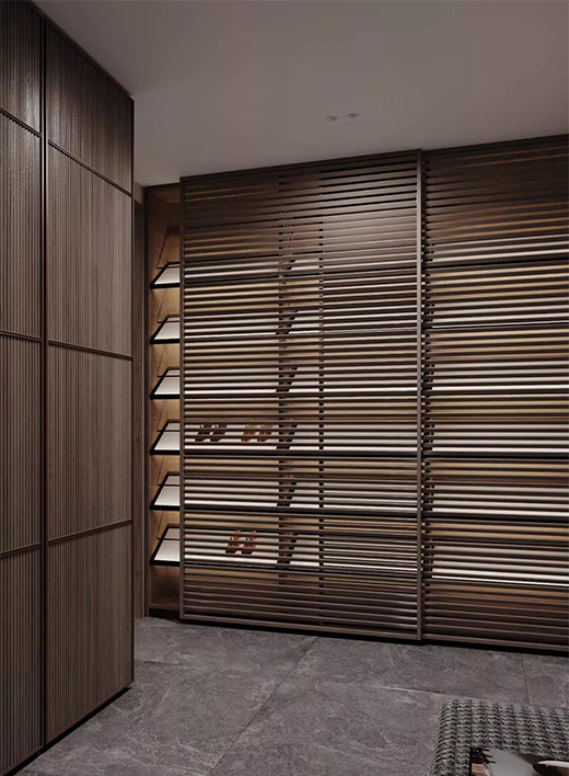 衣帽間是無柜門的簡約設計,多層置衣架滿足日常衣物和鞋子的收納,底部抽屜可用于其他物品收納,整個空間整潔有條理。
