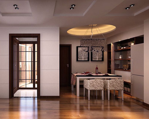 開放式的餐廳與客廳相連接,餐廳采用了灰啡的大地色系,散發出濃厚的藝術氣氛。隨意擺放在深色木地板上的油畫,點綴空間之余,亦保持了室內的簡約氣氛。水泥裸墻與原木餐桌相眏成趣,配以數盞散發淡黃燈光的吊燈,使整張餐廳木地板圖片呈現出溫馨氛圍。