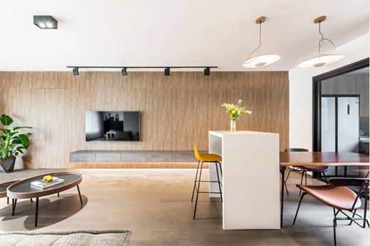 在客廳中,吧臺平面向外延伸,得到了更加寬敞舒適的空間來充當休閑區(qū),尤其是客餐廳一體設計的空間,利用吧臺作為隔斷元素,可以讓兩個空間和置身其中的人產生更多的交流。